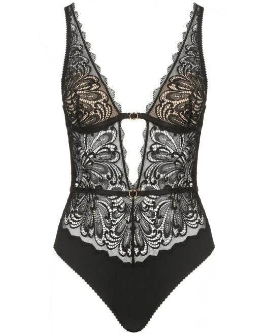 Composée de broderie florale à la transparence suggestive, la lingerie de charme offre un décolleté vertigineux à la découpe élégante en V, maintenu en place à l’aide d’anneaux en métal doré.