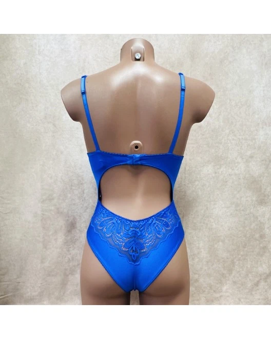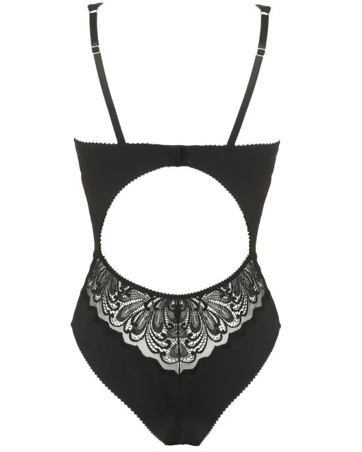 A l’arrière la surprise est de mise, une ouverture laisse le dos ouvert aux caresses, tandis que le creux des reins se couvre de broderie. Le lycra opaque permet de couvrir votre intimité avec élégance.