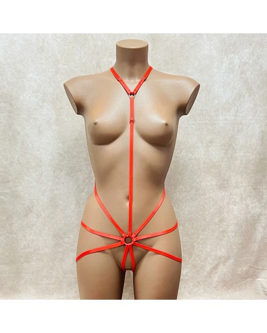 Une bride extensible rend le cou captif, elle redescend jusqu’au bas du ventre où un anneau en métal assure le maintien de toutes les sangles.
