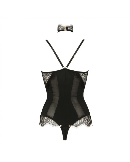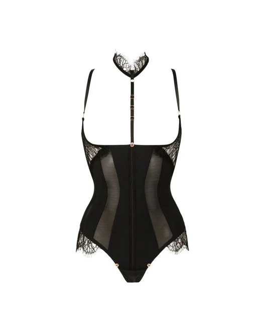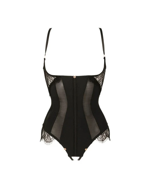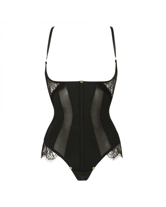 Le somptueux body ouvert sur les seins se pare de dentelle de Calais sur les côtés de la poitrine et sur les hanches, tout en sculptant vos formes féminines avec délice.