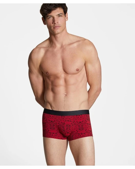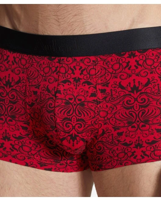 Composé à 100% de coton, le trunck se pare de motifs insufflés par l’univers du tatouage où imprimés ornementaux et motifs végétaux noirs sur un fond rouge passion, se répondent avec douceur.