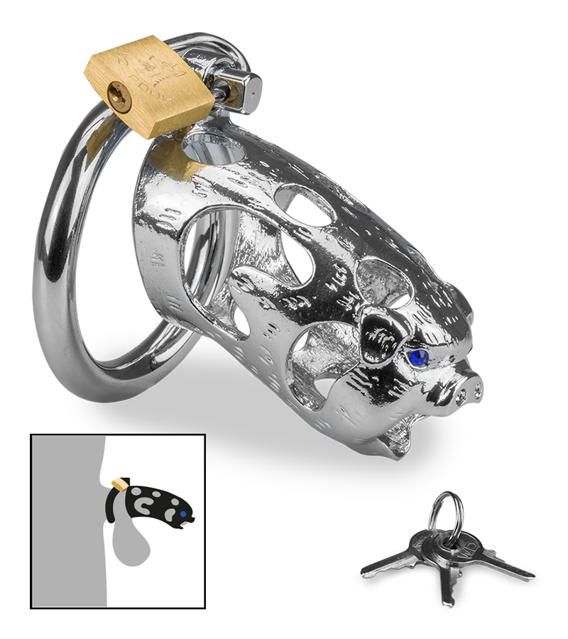 Cette cage pénienne ne vous laissera aucune chance d’assouvir vos désirs sexuels, une fois refermée, seul le possesseur des clefs pourra vous libérer. Son design inspiré du signe du zodiaque chinois du cochon vous rappellera votre condition pour que vous ne puissiez jamais oublier votre position de soumis. La cage possède une ouverture à son extrémité, ce qui vous autorise à aller uriner sans avoir besoin de sortir de la cage, un bon point pour tous ceux qui apprécient de passer de longs moments enfermés.