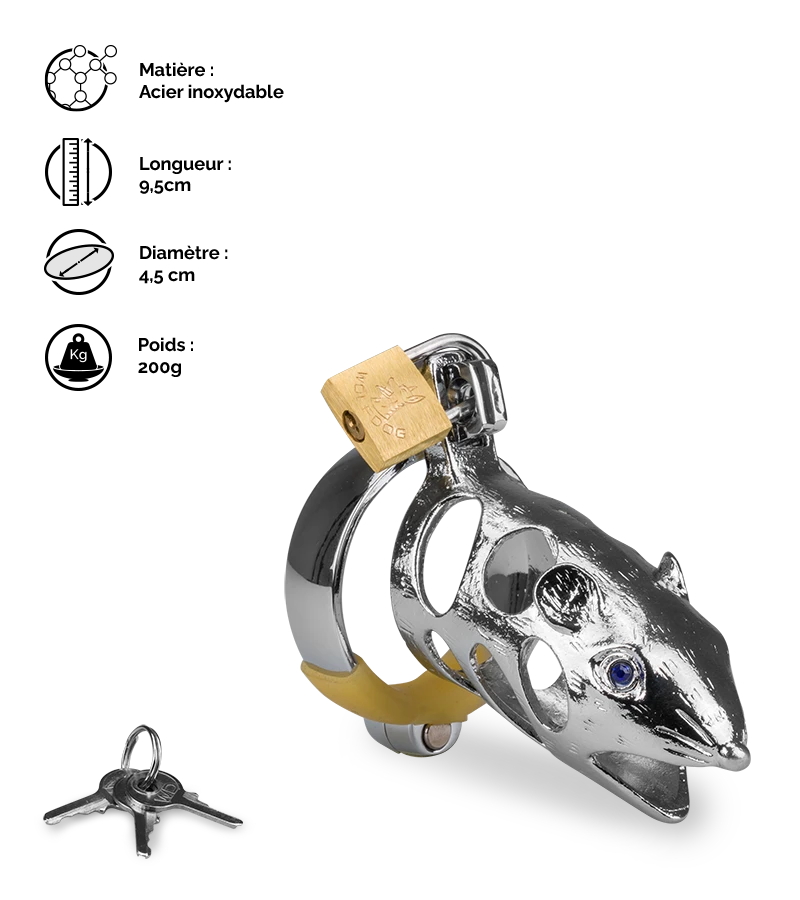 La cage de chasteté pénis astrologie chinoise rat mesure 9,5 cm de longueur totale, le diamètre de l’anneau de maintien est de 4,5 cm. Elle est livrée avec un cadenas et un jeu de trois clefs.