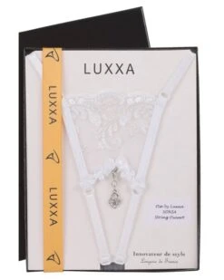 Le harnais se pare d’un empiècement en tulle délicat, dont la transparence subtile révèle votre peau nue en dessous.