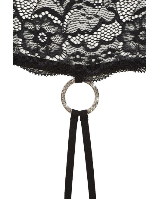 Empiècements de dentelle et brides se rejoignent en son centre et sont maintenus par un anneau bijou, pièce désirable qui attire le regard… Dentelle florale couvre en partie la poitrine pour laisser libre cours à vos désirs.