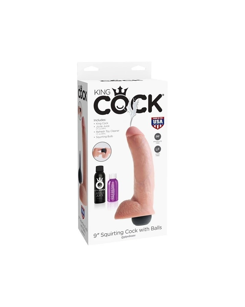 Le sextoy Squirty de la marque King Cock est un gode homme créé aux Etats-Unis avec un système innovant permettant de simuler une éjaculation. Il est composé d’une hampe en PVC souple bien formée avec gland décalotté et bourses. Il est muni d’un réservoir dans une poire qui permet de déclencher l’éjaculation grâce à un gel Sperme. Dimensions: 23cm de long (dont 18cm insérable) et 5 cm de large