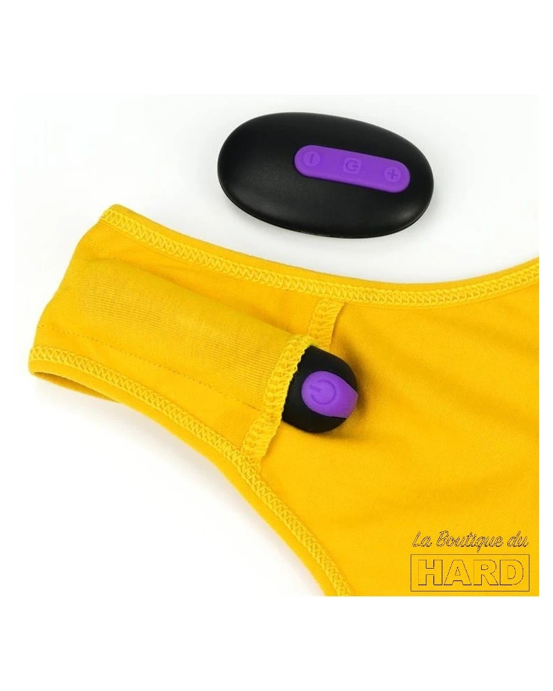 Idéal pour des moments inoubliables, il se compose d’un thong jaune en coton, d’une petite ouverture pour placer le vibro au plus près de votre vulve et de votre clitoris et de 10 modes de vibrations pour encore plus de sensations. Il se recharge via un câble USB et inclut une télécommande avec pile fournie.