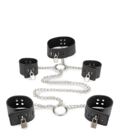 Jouez dans un rapport de domination à l’aide de ces menottes et collier en croix de soumission. Le partenaire soumis subira une contrainte sur cinq points sensibles : les deux poignets, les deux chevilles et le tour de cou. Chaque fermeture possède un cadenas avec deux jeux de clefs. Les membres seront reliés entre eux par des chaines en métal. Vous pouvez vous permettre de nouer ces menottes soit à l’avant soit à l’arrière, en fonction du type de domination que vous souhaitez imposer à votre partenaire.