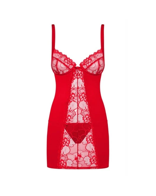 Cette nuisette somptueuse qui honore chacun de vos atouts féminins promet des nuits pleines de caresses. Son petit string rouge assorti vous permettra de créer une parure complète et hautement fantasmatique.