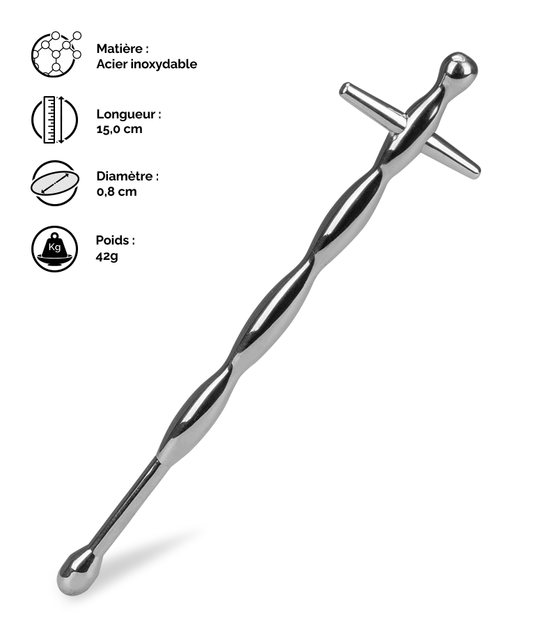 Le plug d’urètre long Sword mesure 15 cm de longueur totale dont 12,5 cm insérables. Son diamètre est de 0,8 cm au point le plus large.