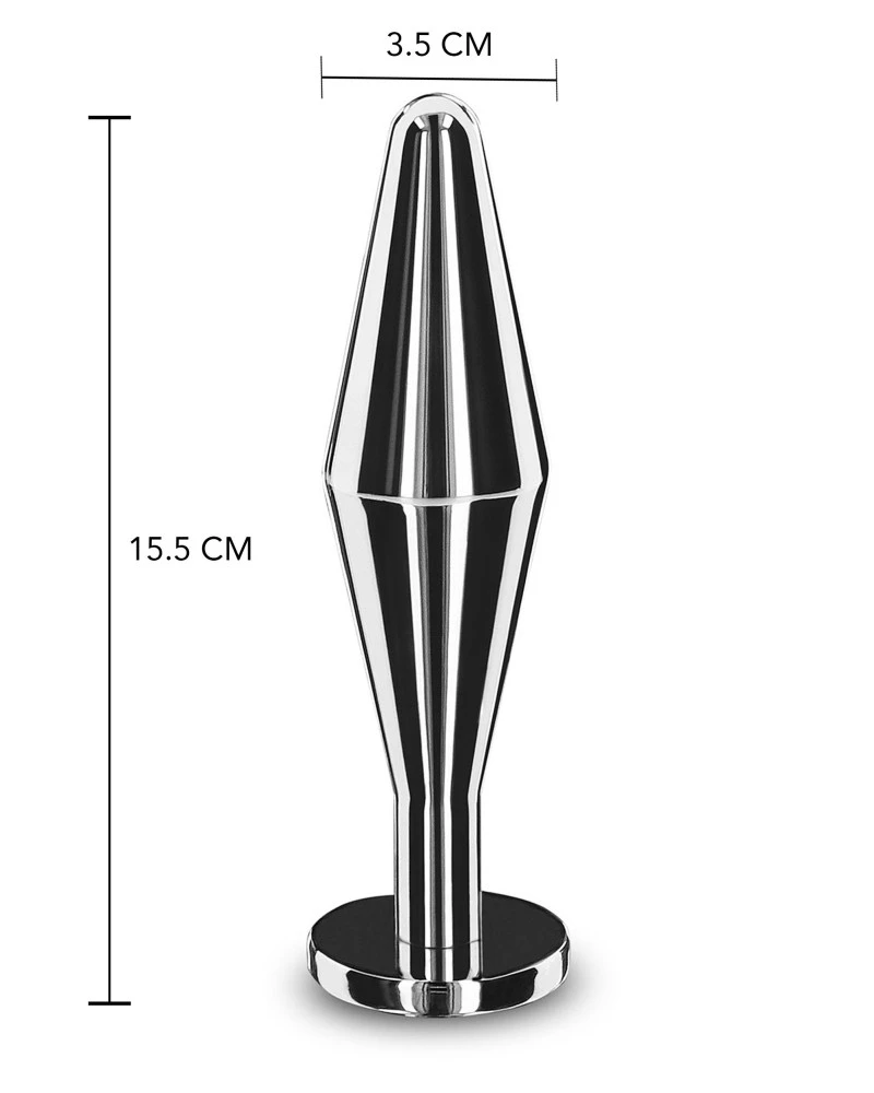 Le plug en métal Massive Steel est conçu avec une forme allongée et une longueur insérable de 14.5cm.La largeur maximale est de 3.8cm.Avec une surface lisse pour une insertion plaisante. Poids de 660 grammes.Avec une base plate. En acier inox