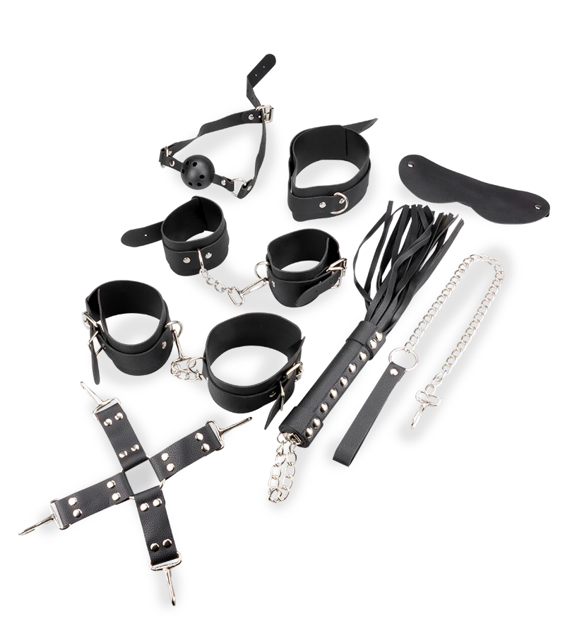 Passez des soirées torrides grâce au set BDSM 8 pièces similicuir et rivets !