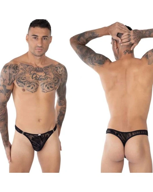 Ce string en tulle noir transparent et flockage sexy se clipse et se déclipse en un rien de temps à l’aide de deux agrafes ingénieuses placées sur l’avant. De quoi séduire les plus impatients !