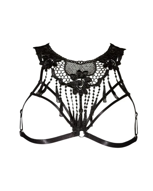 Une fleur brodée en marque le centre et capte tous les regards. Des franges de guipures perlées descendent le long de votre poitrine tout en l’enserrant avec raffinement.